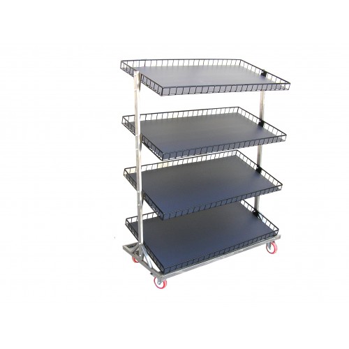Espositore da terra con ruote a ripiani inclinati per esposizione berretti e cappelli, , con piani realizzati da fogli in bilaminato oppure in polipropilene.