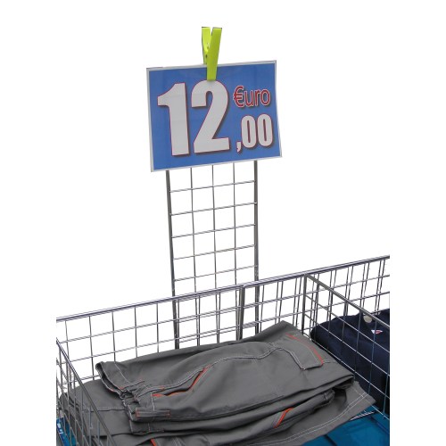 Infilato sotto la cesta o il divisorio diventa pratico e stabile e con una pinza permette la visione dei prezzi in modo chiaro.
