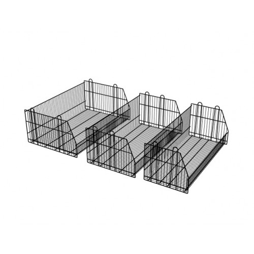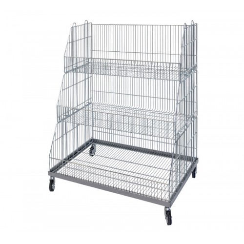 Ceste sovrapponibili, dette anche bocca di lupo, realizzate in filo metallico zincato, molto robuste, impilabili e aperte sul lato da 95 cm per facilitare l'accesso al contenutom della cesta stessa.