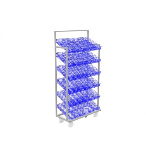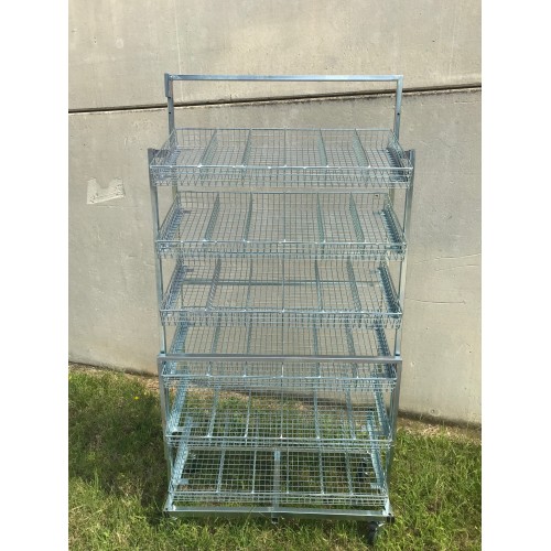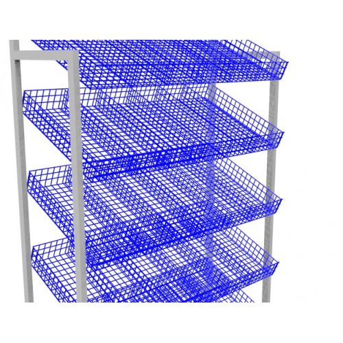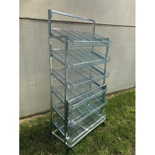 Espositore composto da ceste inclinate in filo metallico, fissate ad una struttura in tubolare in acciaio inox.