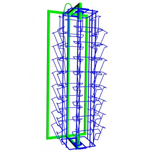 Espositore per cartoline girevole da fissare al muro, realizzato con una struttura che facilmente si fissa al muro mentre il corpo centrale girevole realizzato con quattro faccie ognuna con 9 tasche si può montare/smontare con un semplice gesto tra i due poli alle estremità che ne permettono la rotazione.