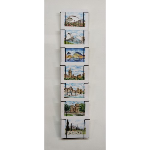 Espositore da muro realizzato in filo metallico con rivestimento plastico per cartoline 24x30 cm.