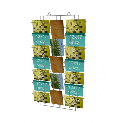 Espositore da muro per cartoline formato 12x17 cm realizzato in filo metallico. Ideale per l’esposizione ordinata e visibile di cartoline in negozi, edicole, fiere e punti vendita.