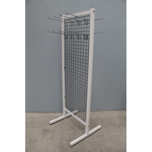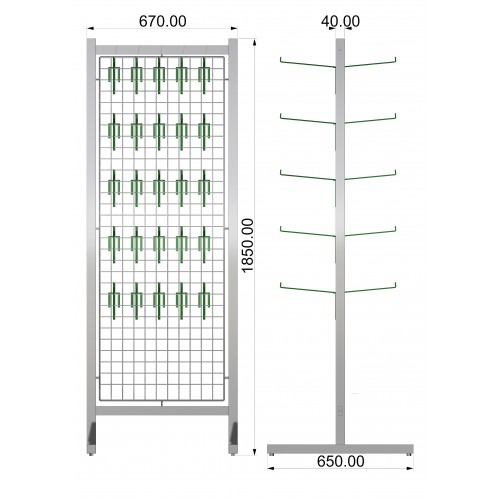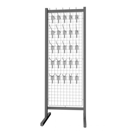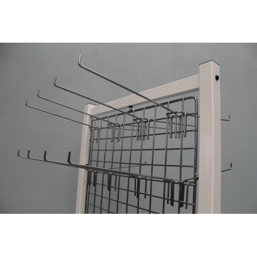 Il corpo centrale è caratterizzato da una rete metallica con maglia 5x5 cm a cui è possibile agganciare porta blister o ganci di svariate misure.