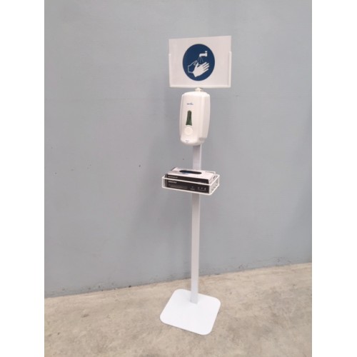 Attraverso dei fori lungo tutta la sua altezza può essere attrezzata con un porta gel disinfettante e una cesta porta guanti monouso.