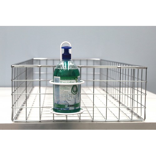 Porta flacone dispenser per gel igenizzante mani, disponibile in due modelli : uno da fissare alle ceste in filo metallico e un altro da fissare alla struttura in alluminio di qualsiasi tipo di gazebo.