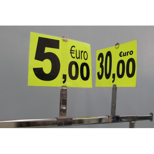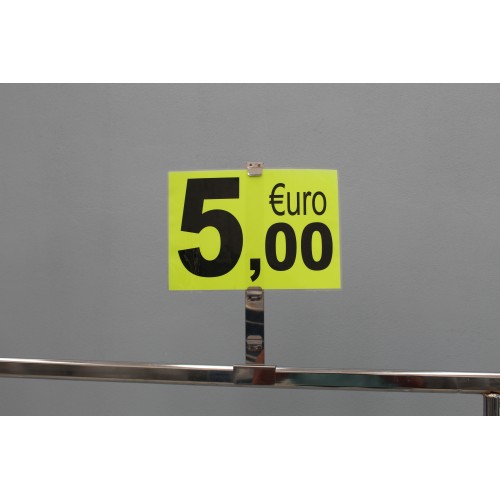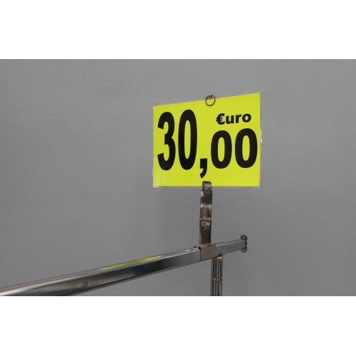 Portaprezzo realizzato in acciaio inox leggero, pratico e resistente agli agenti atmosferici, da aggangiare alla barra superiore dello stender.